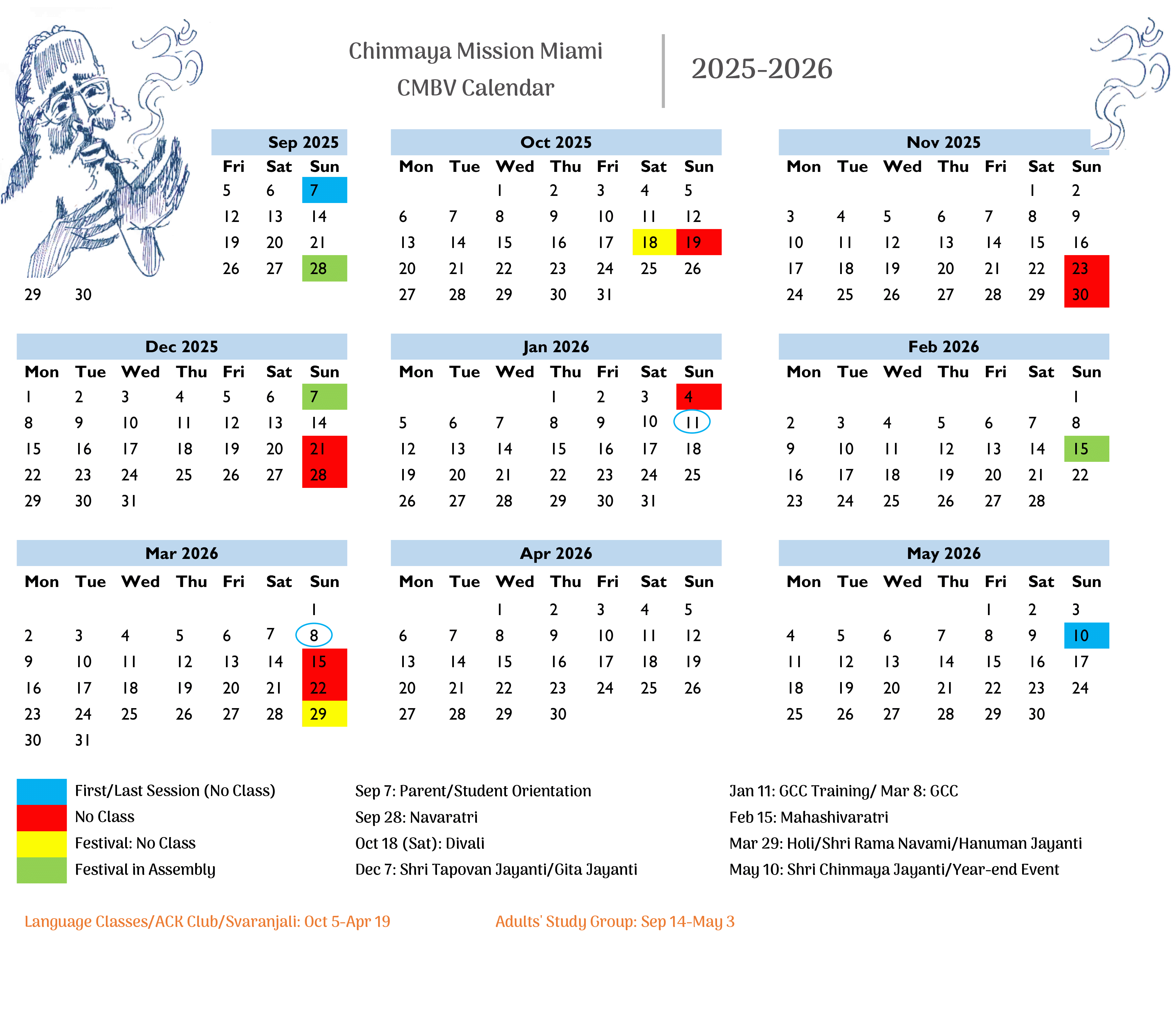 View the image below for calendar of classes/events. Note the Start/End Dates for CMBV/Language Classes/ACK Club/Svaranjali/Adults' Study Group.