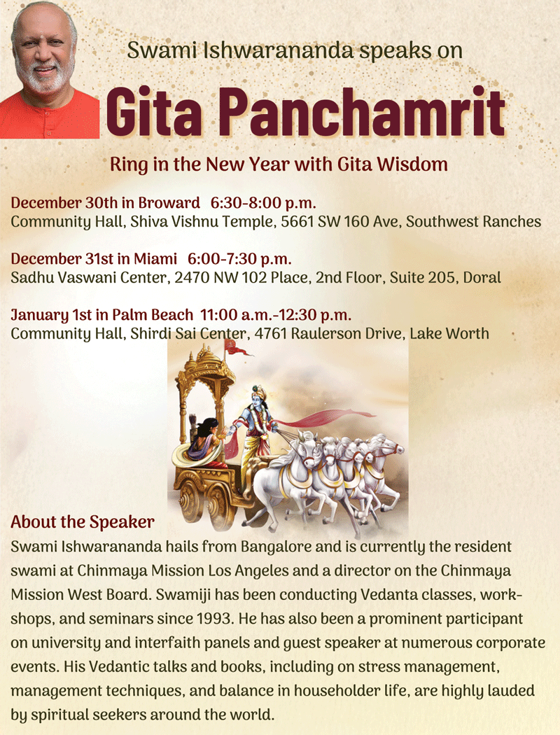 Dec 30-Jan 1: Ring in the New Year with Gita Wisdom - Join us for Gita Panchamrit (5 essential Gita verses) talks by Swami Ishwarananda (CM Los Angeles)   Free, in English, open to all  View details